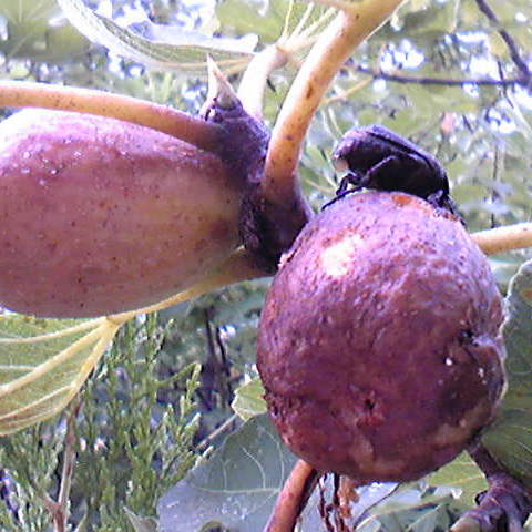 お盆の前後から当地ではイチジクが熟しはじめる!我が家の庭にも一本イチジクがあるが、色づき始めるとカナブンが何処からともなく現れ頭を突っ込み収穫前を食い荒らす!まぁ〜一個位は自然の節理と大目に見ているのだが…今朝の鳥(?)の食い散らかしには…堪忍袋の緒がきれた!!対策を起じなければ…・!!(>_<)!!