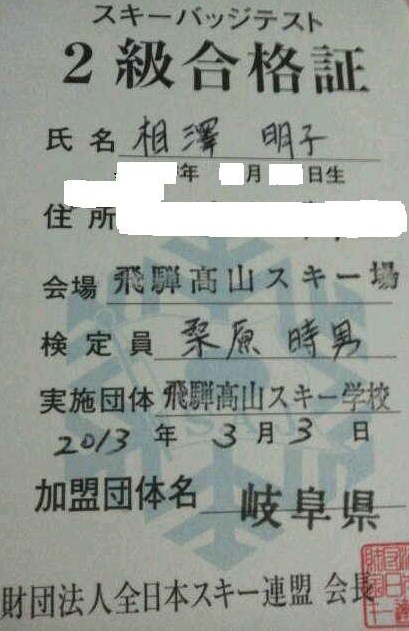 スキーバッジテスト二級合格証