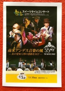 9月5日午後から“宗次ホール”でのスイーツタイムコンサート『南米アンデス音楽』を